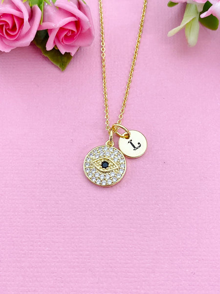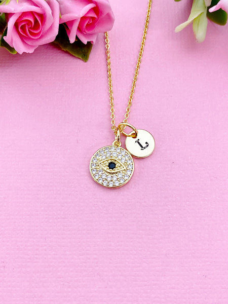 This is a gold-tone evil eye charm with hand stamped initial charm on brass/stainless steel 18 inches chain.
