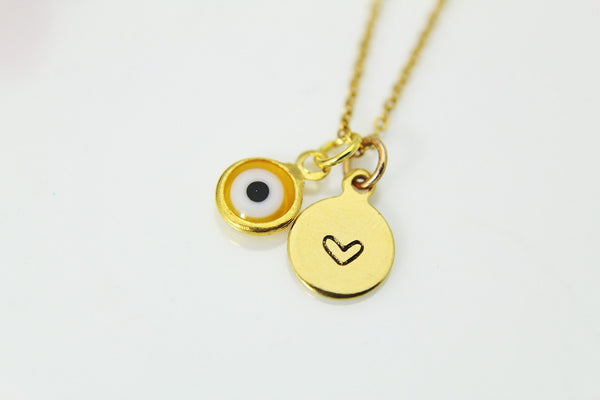 This is a gold-tone evil eye charm with hand stamped initial charm on a stainless steel chain. (WILL NOT TARNISH or GREEN) You able to choose initial from a drop-down menu.