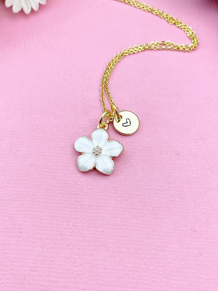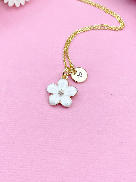This is a gold-tone flower charm with hand-stamped initial charm on gold over stainless steel chain.