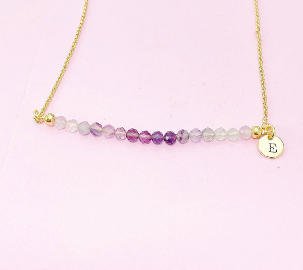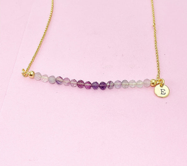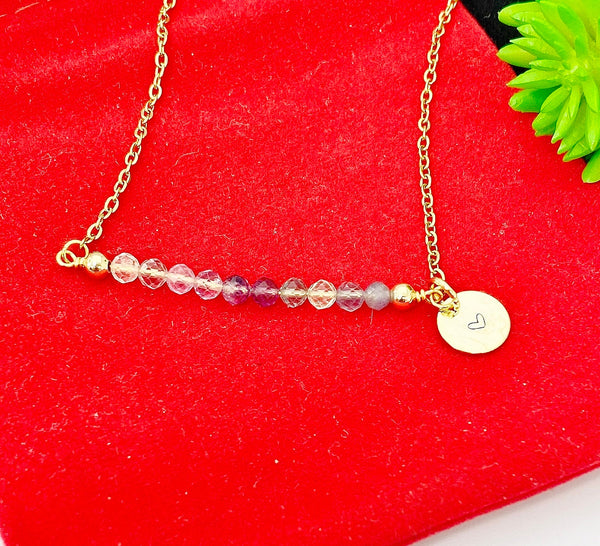 This is gold tone Fluorite charm with hand stamped initial charm on brass or stainless-steel chain.