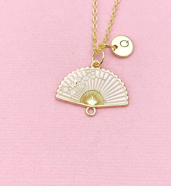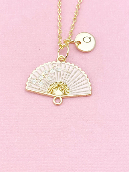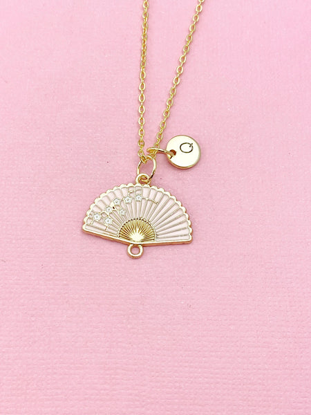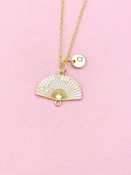 This is a gold -tone Folding Hand Fan charm with hand stamped initial charm on brass/stainless steel 18 inches chain or bracelet or keyring.