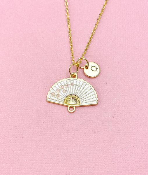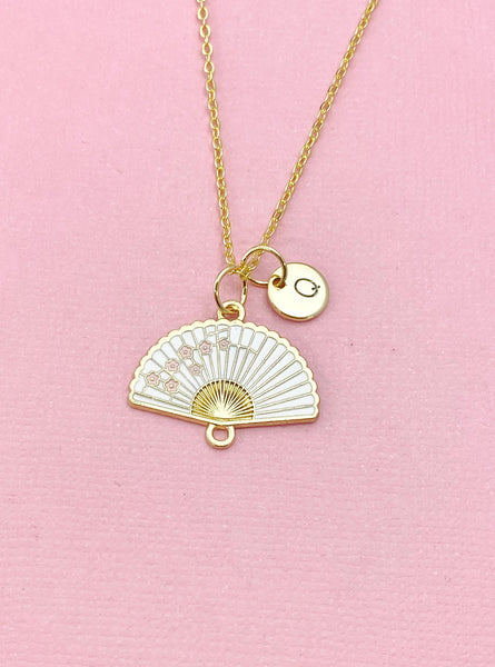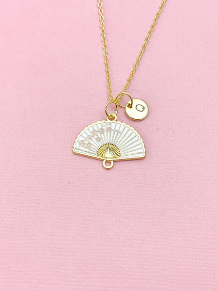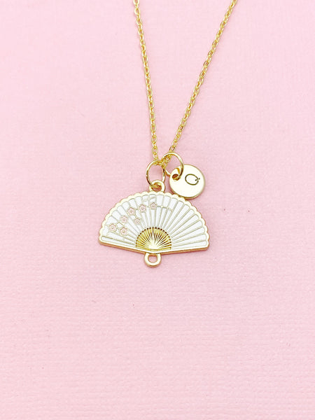 This is a gold -tone Folding Hand Fan charm with hand stamped initial charm on brass/stainless steel 18 inches chain or bracelet or keyring.