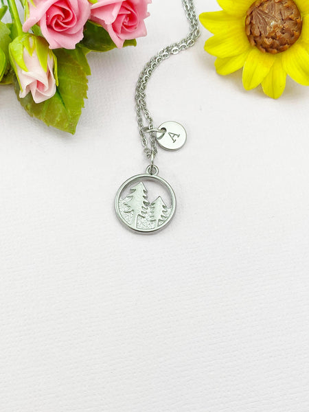 This is a silver -tone forest with pine tree charm with hand stamped initial charm on brass/stainless steel 18 inches chain or bracelet or keyring.