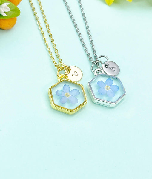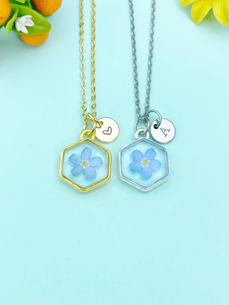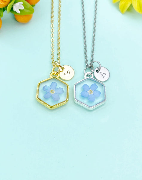 This is a gold or silver-tone real press forget me not charm with hand stamped initial charm on brass or stainless-steel chain.