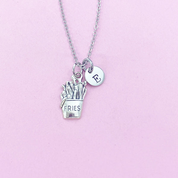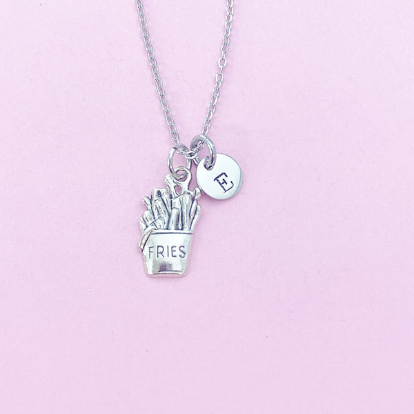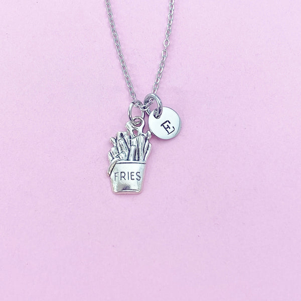 This is a silver-tone fries charm with hand stamped initial charm on stainless steel necklace.