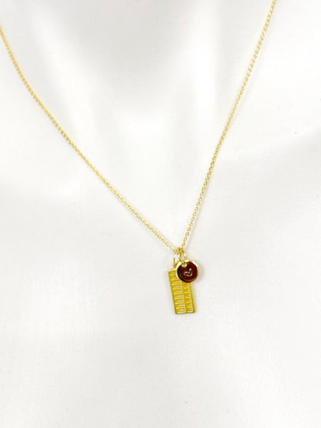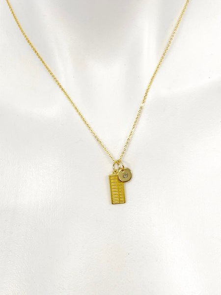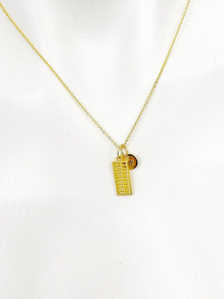 This is a gold -tone Abacus charm with hand stamped initial charm on brass/stainless steel 18 inches chain.