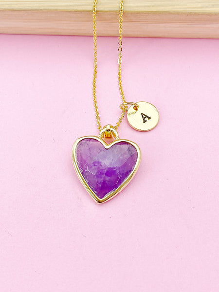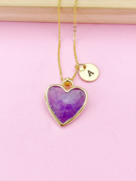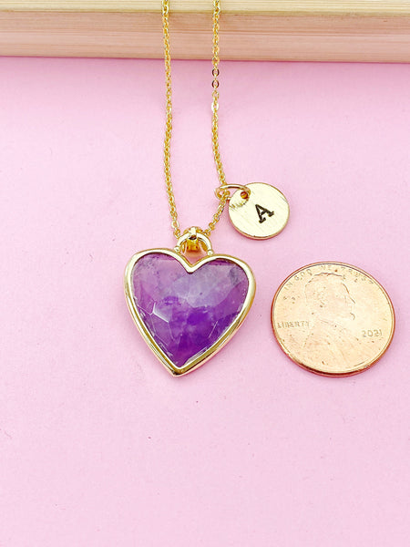 This is gold tone Amethyst heart charm with hand stamped initial charm on brass/stainless steel 18 inches chain.