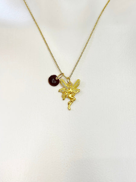 This is a gold -tone angel charm with hand stamped initial charm on stainless steel or brass chain.
