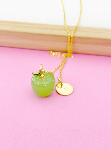 This is gold tone apple charm with hand stamped initial charm on brass or stainless-steel chain.