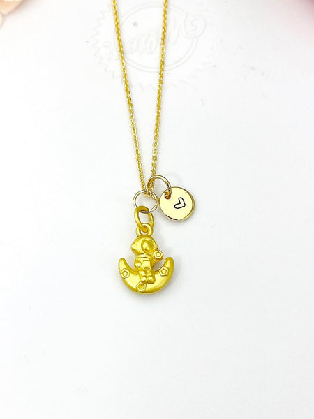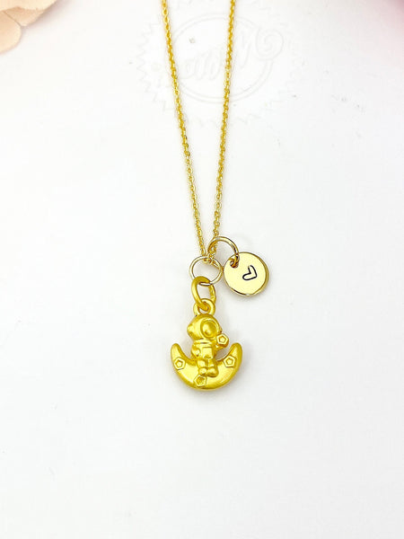 This is a gold -tone Astronaut sit on the Moon with the Star charm with hand stamped initial charm on brass/stainless steel 18 inches chain.