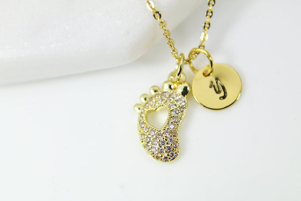 This is a gold-tone Z bass zirconia footprint charm with hand stamped initial charm on brass/stainless steel 18 inches chain.