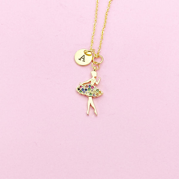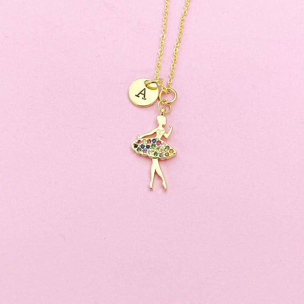 This is gold tone Ballet Dance Girl charm with hand stamped initial charm on brass or stainless-steel chain.