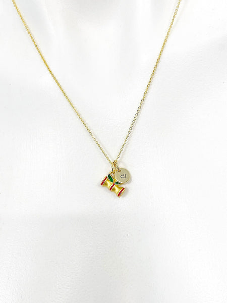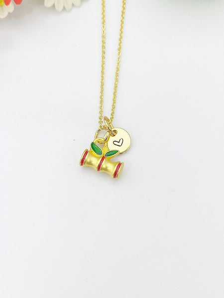 This is a gold -tone Bamboo Stick charm with hand stamped initial charm on brass/stainless steel 18 inches chain.