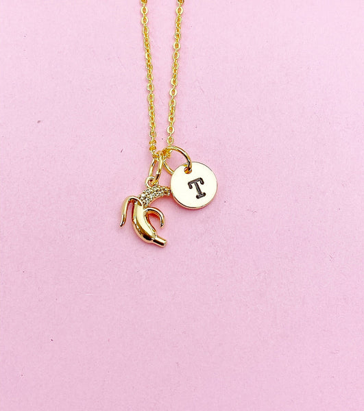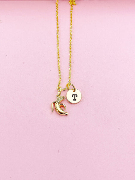 This is gold tone banana charm with hand stamped initial charm on brass or stainless-steel chain.