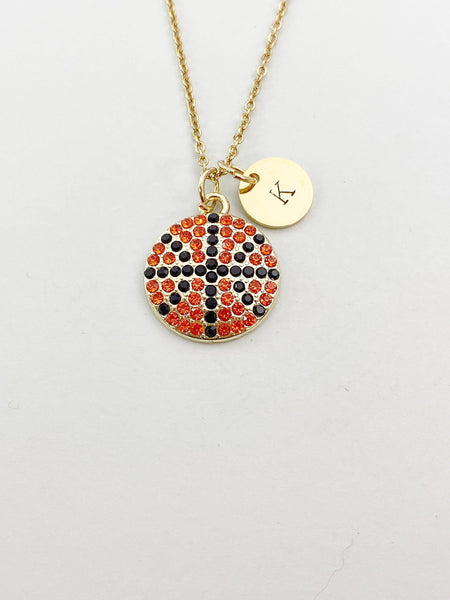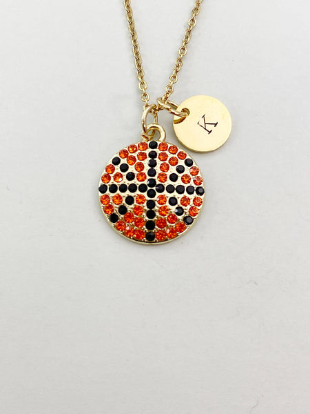 This is a gold -tone basketball charm with hand stamped initial charm on brass or Tarnish Resistant stainless steel 18 inches chain.