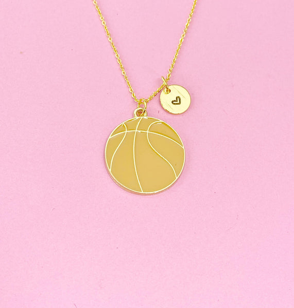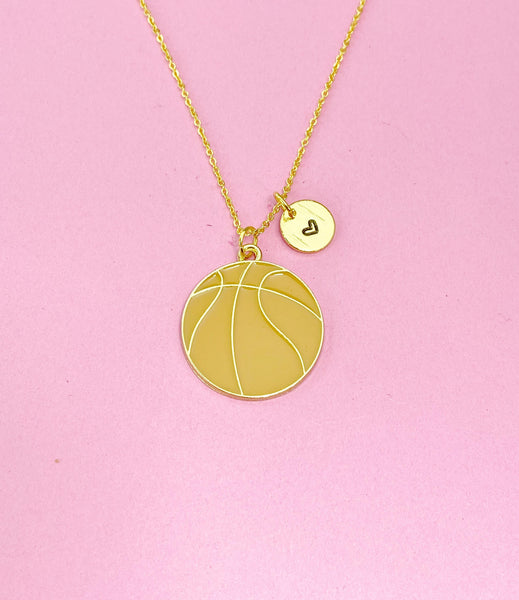 This is a gold tone basketball charm with hand stamped initial charm on brass or stainless-steel chain.