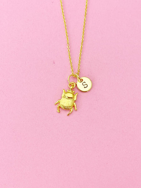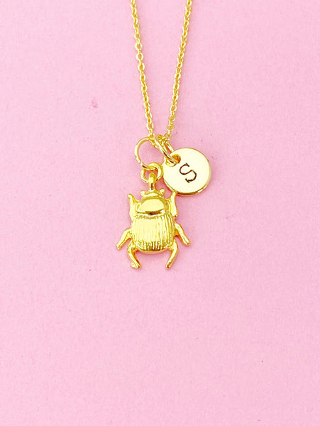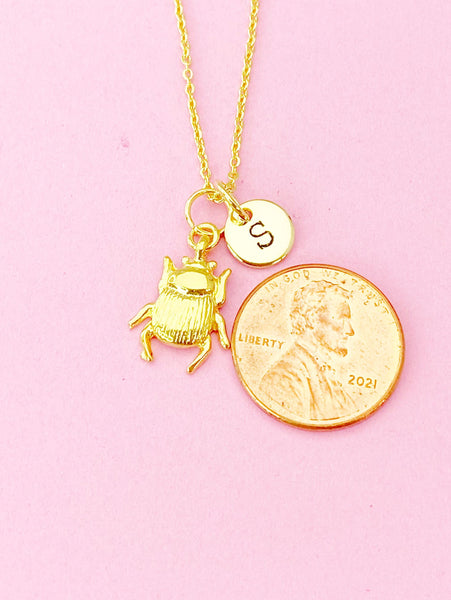 This is a gold tone beetle charm with hand stamped initial charm on a stainless-steel chain.