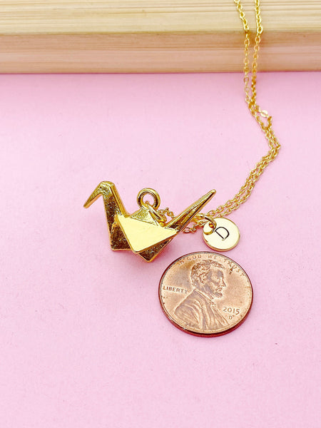 This is gold tone crane charm with hand stamped initial charm on brass or stainless-steel chain.