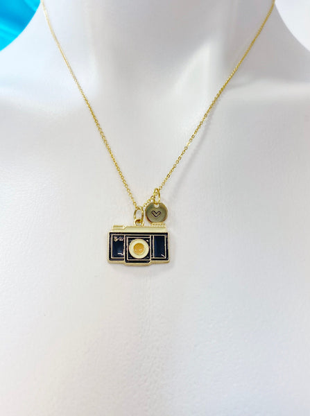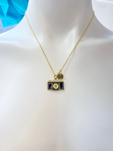 This is an alloy enamel camera charm with hand stamped initial charm on brass or stainless-steel chain.