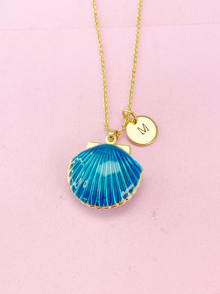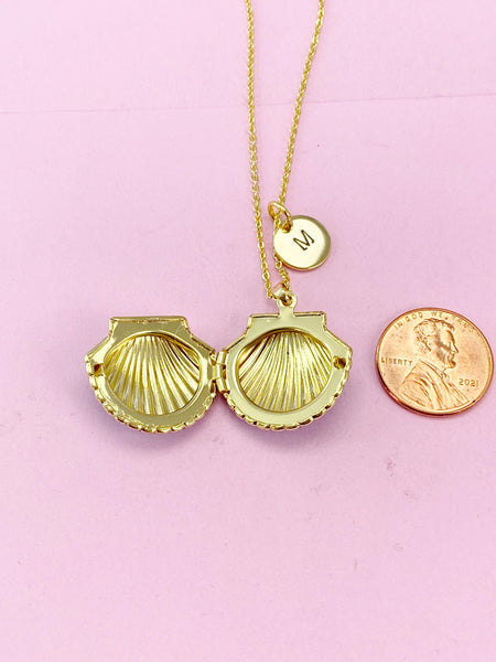 This is gold tone shell locket charm with hand stamped initial charm on brass/stainless steel 18 inches chain.