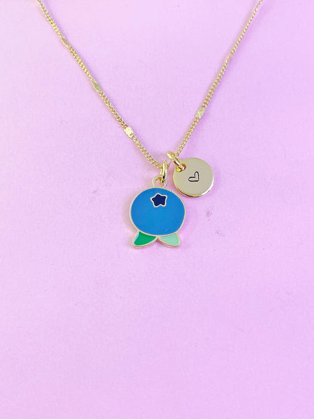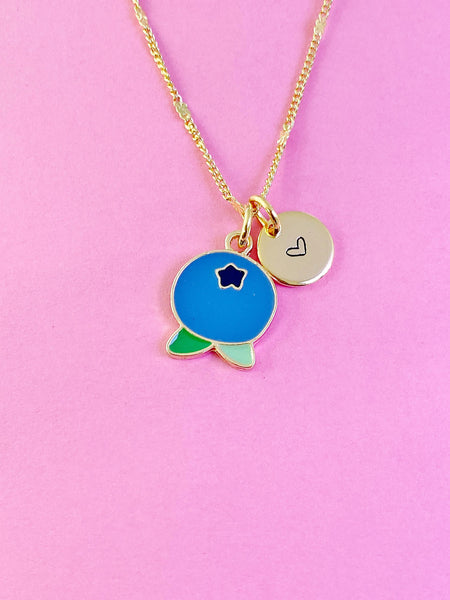 This is a gold -tone Blueberry charm with hand stamped initial charm on brass/stainless steel 18 inches chain.
