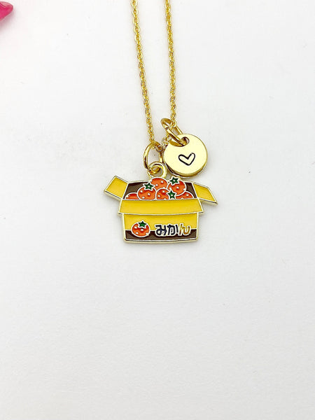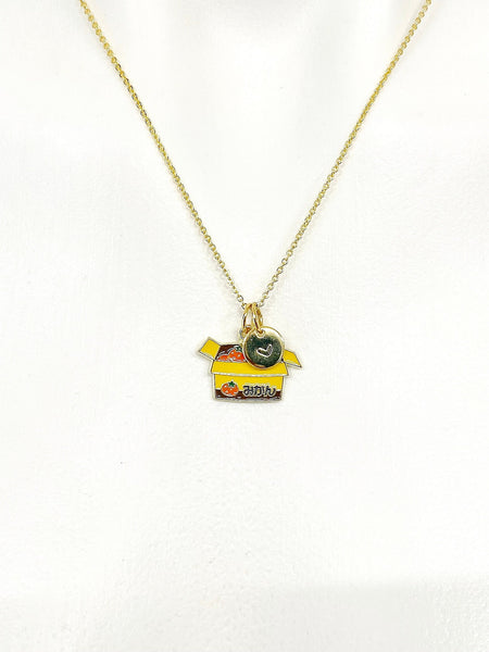 This is gold tone Box of Orange charm with hand stamped initial charm on brass/stainless steel 18 inches chain.