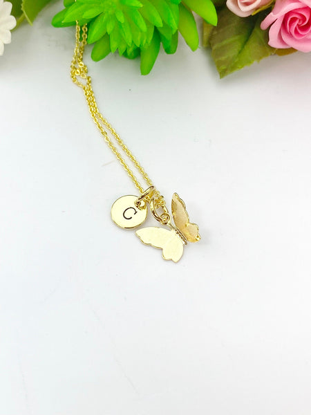 This is a gold -tone Butterfly charm with hand stamped initial charm on brass/stainless steel 18 inches chain.