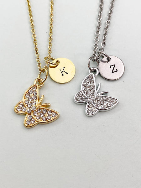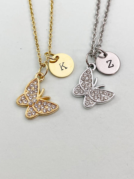 This is a gold -tone butterfly charm with hand stamped initial charm on brass or stainless steel 18 inches chain.