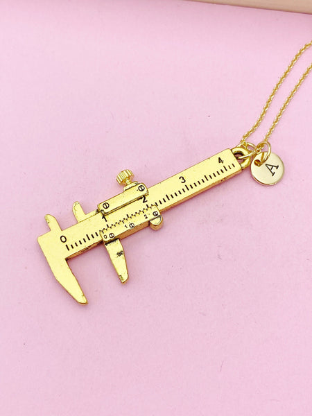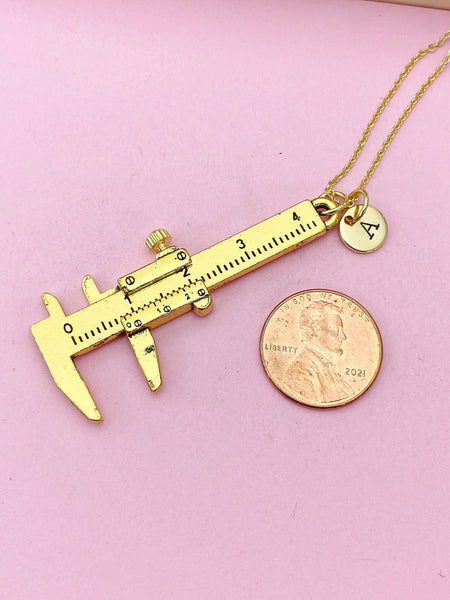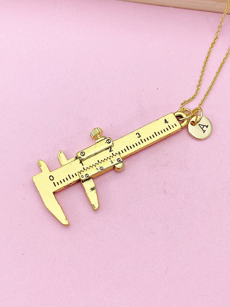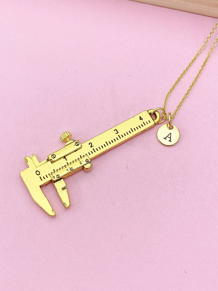 This is a gold - tone Caliper charm with hand stamped initial charm on brass or stainless steel 18 inches chain.