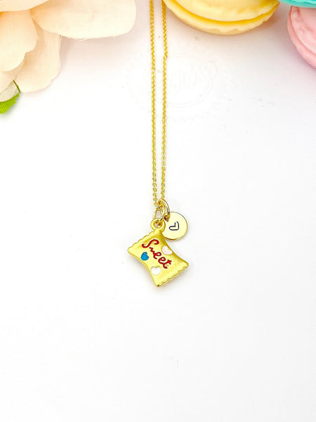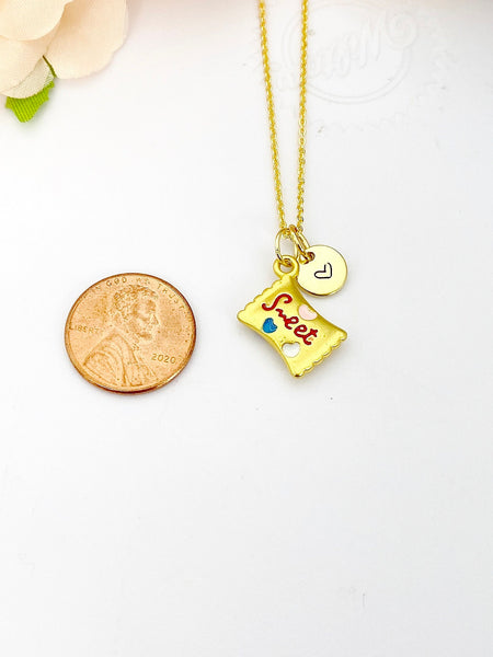 This is a gold -tone Candy with Word Sweet charm with hand stamped initial charm on brass/stainless steel 18 inches chain.