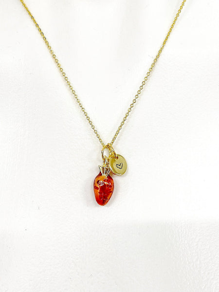 This is gold tone carrot charm with hand stamped initial charm on brass/stainless steel 18 inches chain.