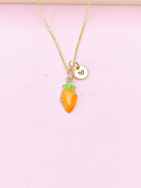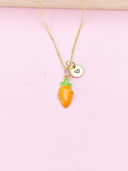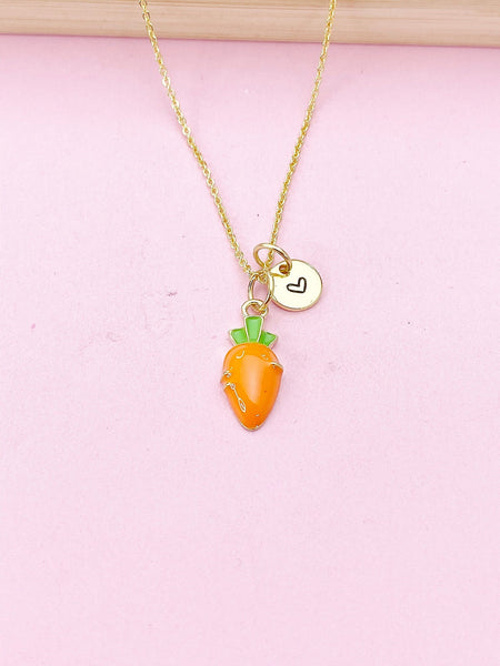 This is gold tone carrot charm with hand stamped initial charm on brass or stainless-steel chain.