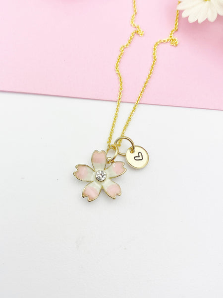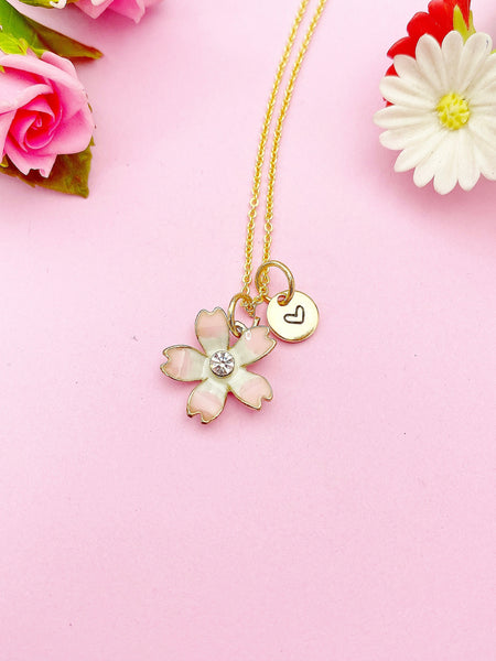 This is gold tone flower charm with hand stamped initial charm on brass or stainless steel 18 inches chain.