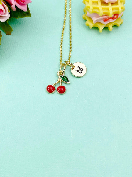 This is a gold tone cherry charm with hand stamped initial charm on brass or stainless-steel chain.