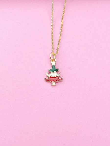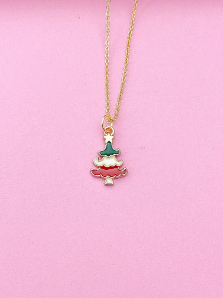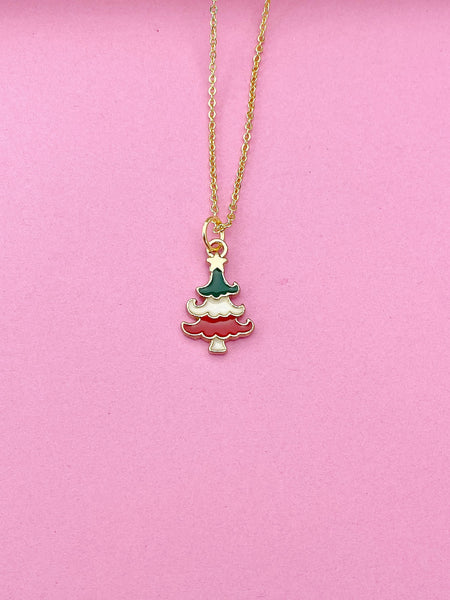 This is a gold-tone Christmas tree charm on brass or stainless-steel chain.