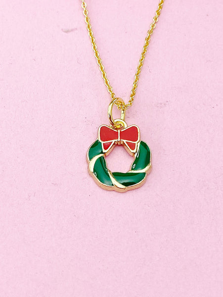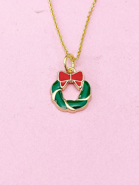 This is gold tone Christmas wreath charm on brass or stainless-steel chain.