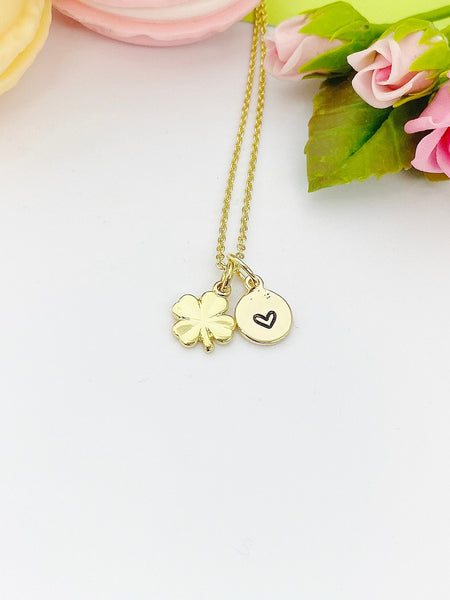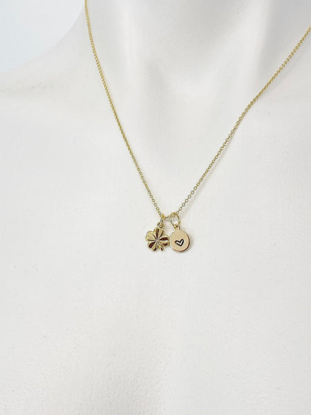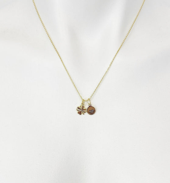 This is gold tone clover charm with hand stamped initial charm on brass/stainless steel 18 inches chain.