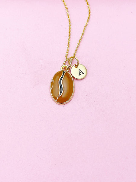 This is a gold -tone coffee bean charm with hand stamped initial charm on brass/stainless steel 18 inches chain.