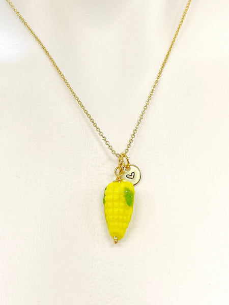 Gold Corn Cob Necklace, Handmade Lampwork Yellow Corncob Charm, Personized Initial Necklace,