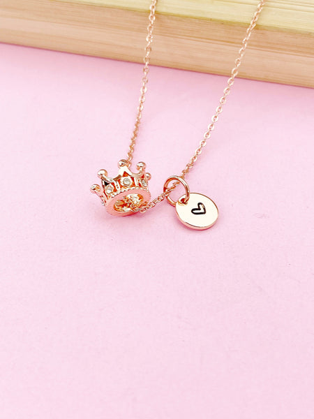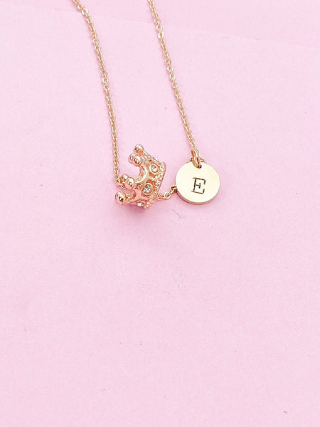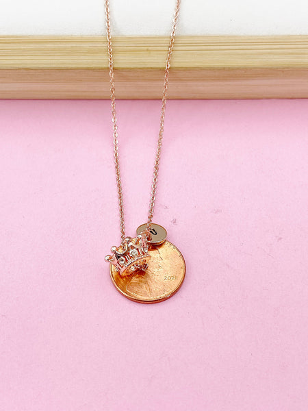 This is a gold-tone crown charm with hand stamped initial charm on stainless steel necklace.