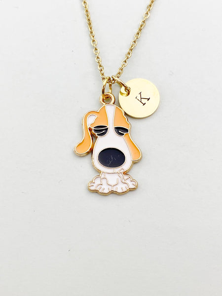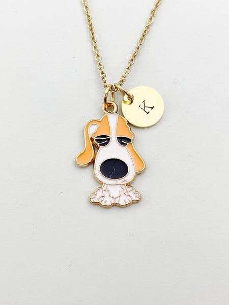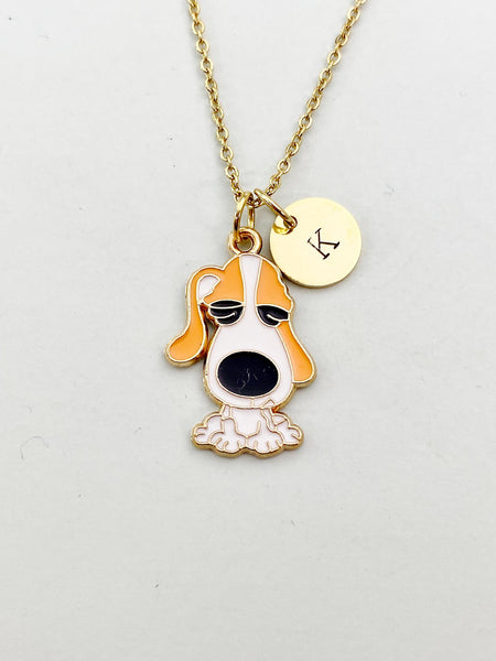 This is a gold -tone cute dog charm with hand stamped initial charm on brass or stainless steel 18 inches chain.