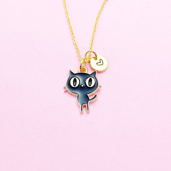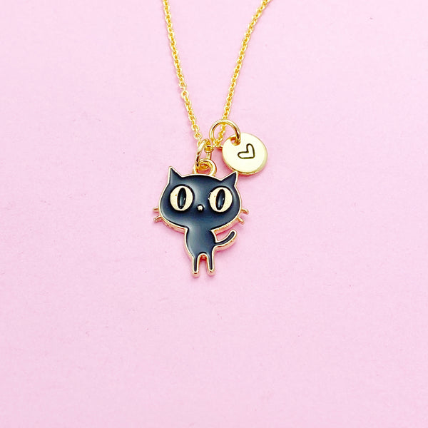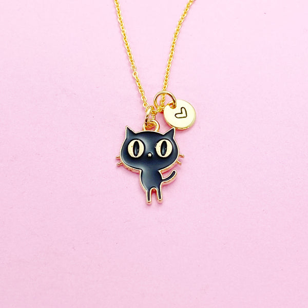 This is a gold-tone cat charm with hand stamped initial charm on brass or stainless-steel chain.