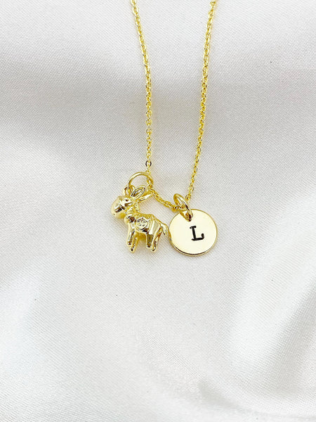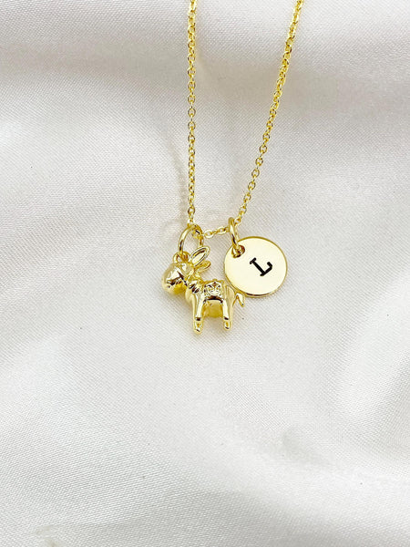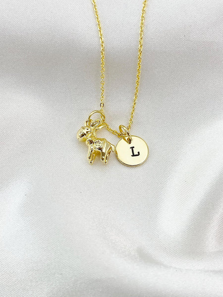 This is a gold tone cute dinkey charm with hand stamped initial charm on brass or stainless-steel chain.