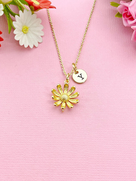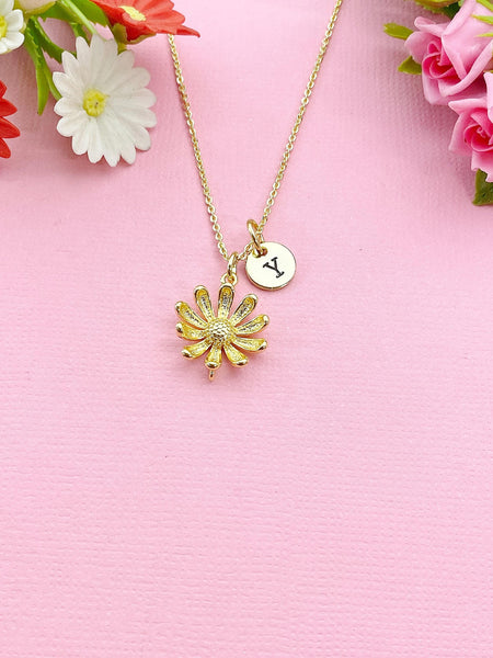 This is a gold -tone daisy charm with hand stamped initial charm on brass or stainless steel 18 inches chain.