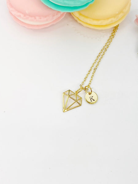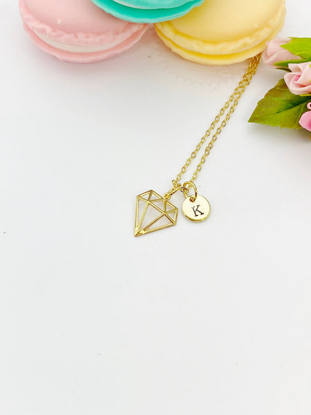 This is a gold or gold-tone diamond shaped charm with hand stamped initial charm on 18 inches chain.
