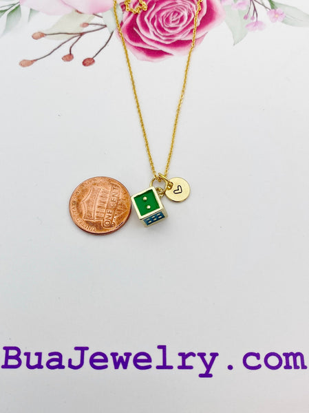 This is an alloy dice charm with hand stamped initial charm on a stainless-steel or brass chain.