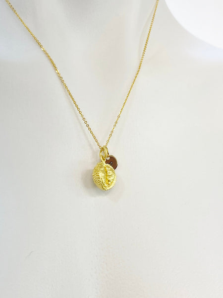 This is a gold -tone durian charm with hand stamped initial charm on brass/stainless steel 18 inches chain.