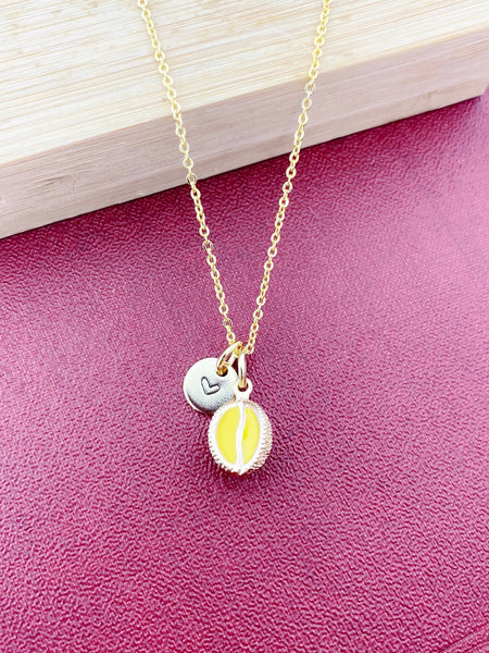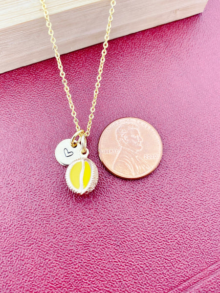 This is gold tone yellow durian charm with hand stamped initial charm on brass/stainless steel 18 inches chain.