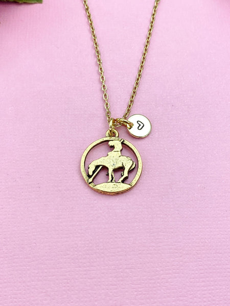 This is a gold tone End Of Trail charm with hand stamped initial charm on brass/stainless steel 18 inches chain.