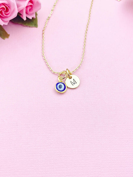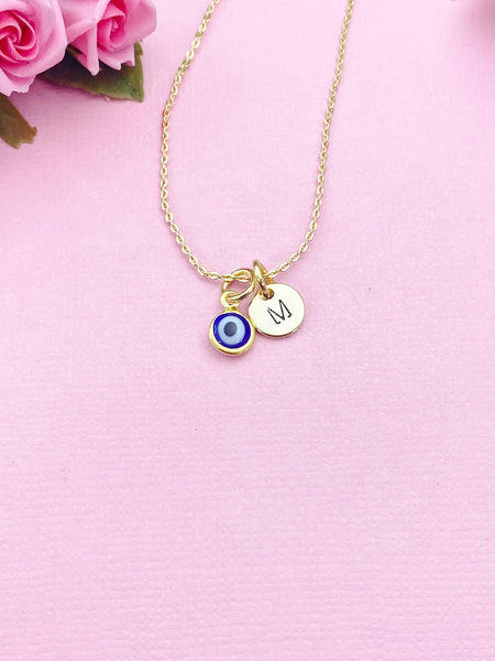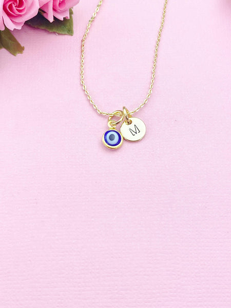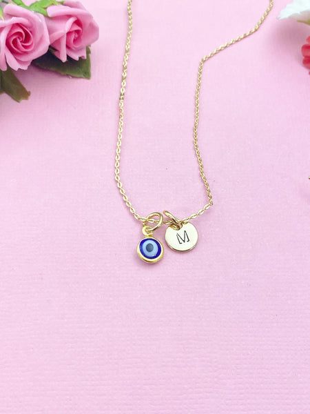 This is a gold-tone TINY evil eye charm with hand stamped initial charm on brass/stainless steel 18 inches chain.